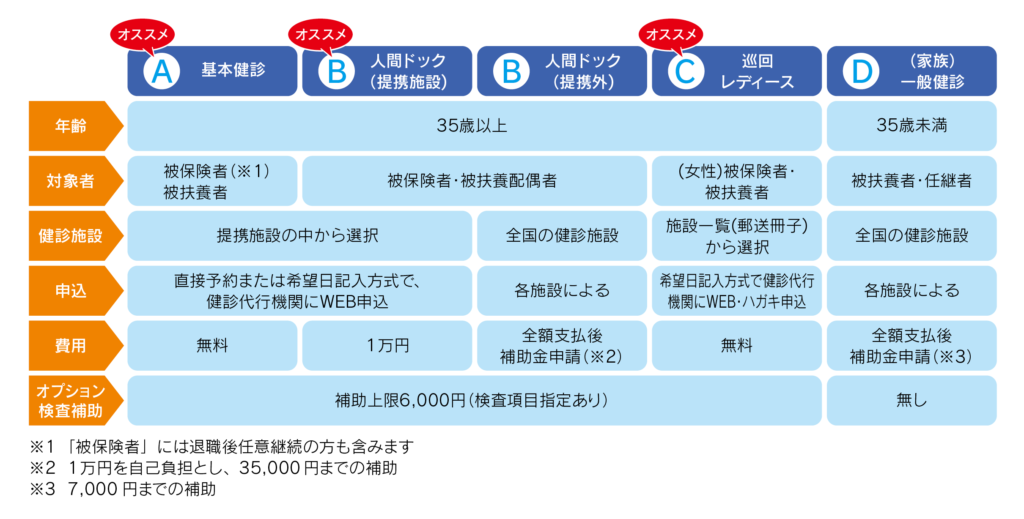 今年度より、健診代行機関(株式会社LSIメディエンス)が提携する施設(※1)であれば、自己負担1万円のみで人間ドックコースを受診できます。その1万円は皆様から受診施設に直接お支払い頂くことで、昨年度までのような給与控除や健康保険組合への振込みは発生致しません。人間ドックにもオプション検査6,000円までの補助がございます(検査項目指定あり)。