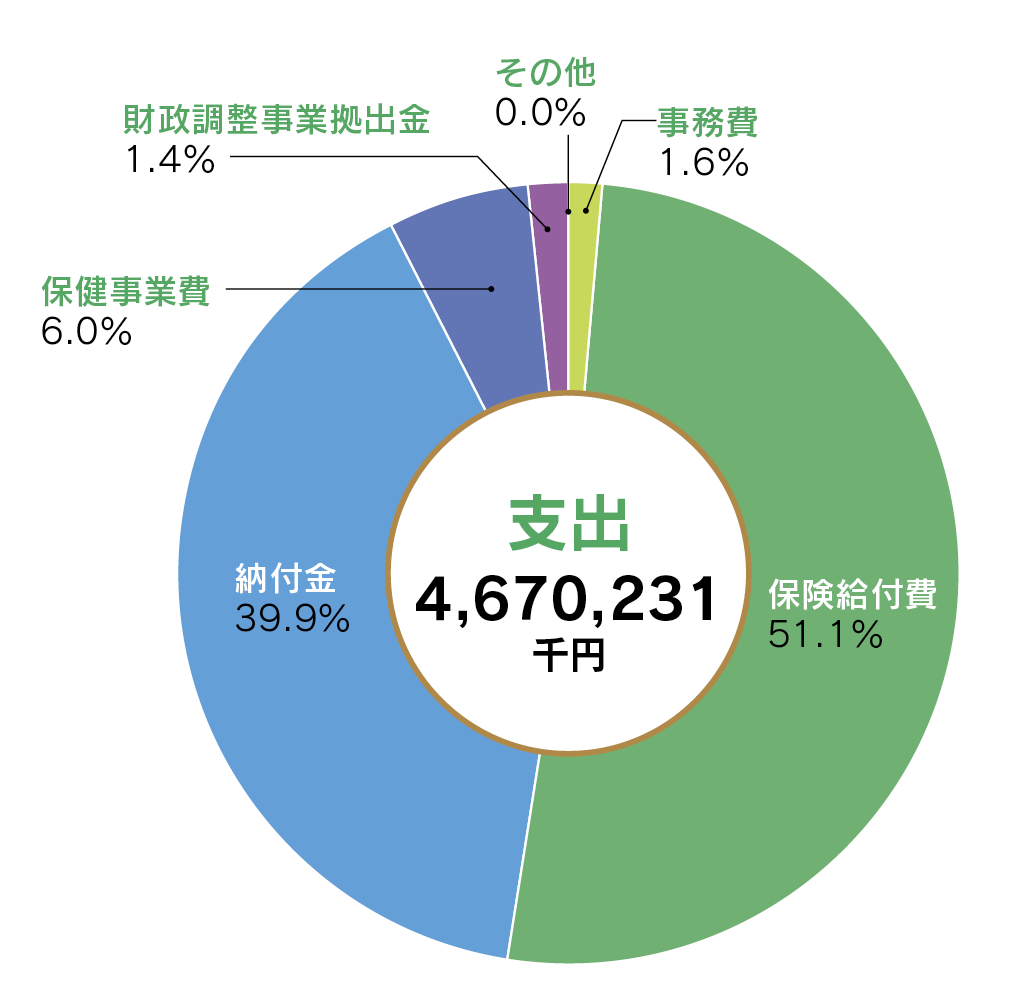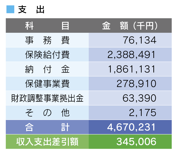 支出では、前年度比39,179千円増となりました。これは納付金が122,164千円減少した一方で、前年度のコロナ禍における医療機関の受診控えによる影響で今年度は保険給付費が156,406千円増加した結果によるものです。
