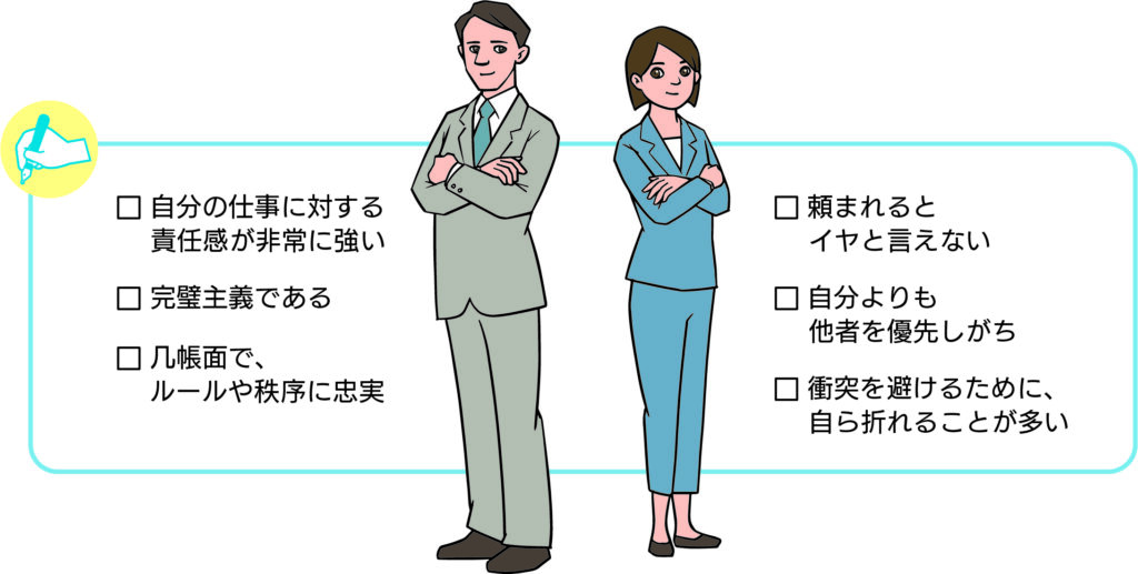 責任感が強く、任された仕事にしっかり取り組む生真面目リーダータイプは、組織において非常に重宝される人材です。しかも頼みごとを断らないので、周りからもよく頼られます。しかしその反面、手抜きができず、他の人にうまく頼ることが苦手なので、自分だけで問題を抱え込みやすくキャパオーバーしがちです。加えて、相手の言動に異議や反感を感じても、衝突を避けるために、自分の中にため込んでしまいます。そのため、何か一つうまくいかなくなると、負のスパイラルに陥ってしまいます。このタイプは精神医学用語で「メランコリー親和型」と呼ばれ、実は日本人のうつ病患者に一番多いタイプです。