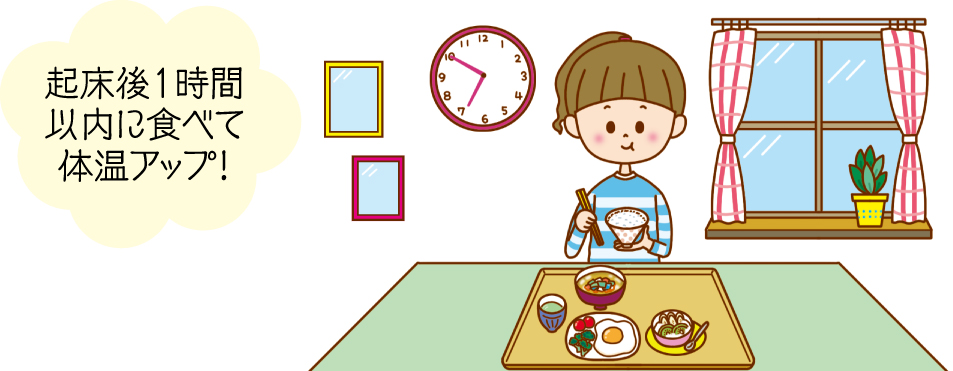 起床後早めの時間に食べることで、体内時計がリセットされ体温が上がり、1日を通してエネルギーを消費しやすい体になります。