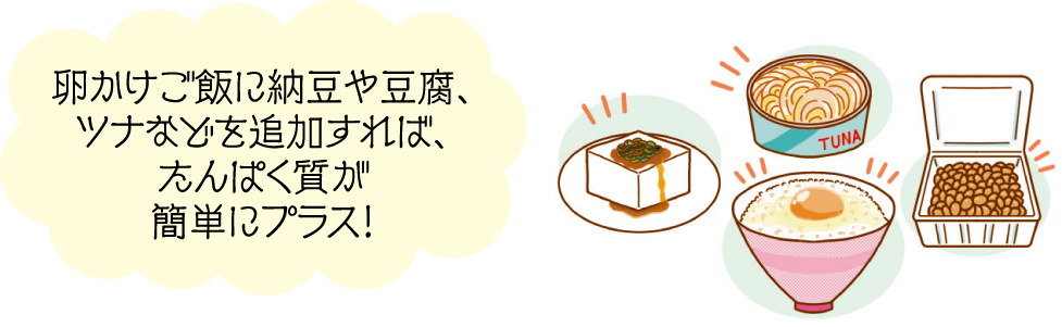 炭水化物を十分な量とりましょう。パンよりご飯のほうが炭水化物を多くとりやすく、素早くエネルギーに変わります。たんぱく質を組み合わせることで、さらにエネルギーを消費しやすくなります。ご飯に添える卵や納豆、豆腐、ツナなどを普段から準備しておくのがおすすめです。