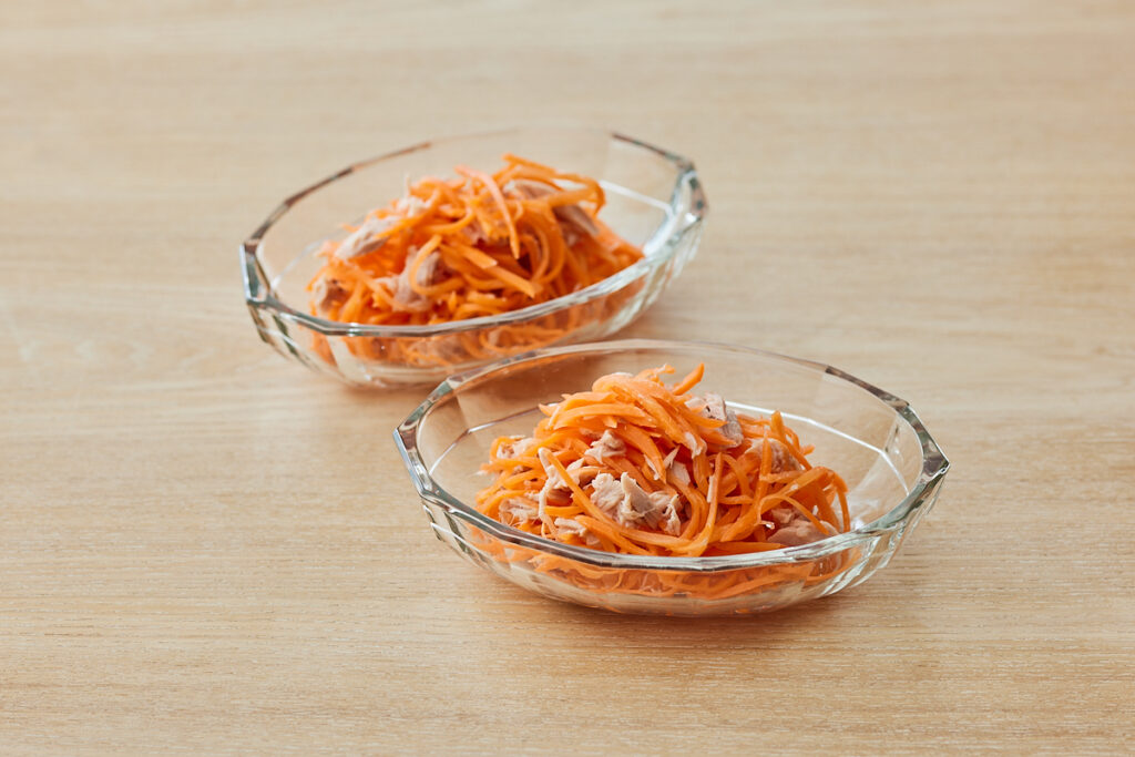 - にんじんは千切りにしてボウルに入れ、塩をまぶして 10分ほどおく。しんなりしたら水気を絞る。ツナ缶は 汁気を切る。