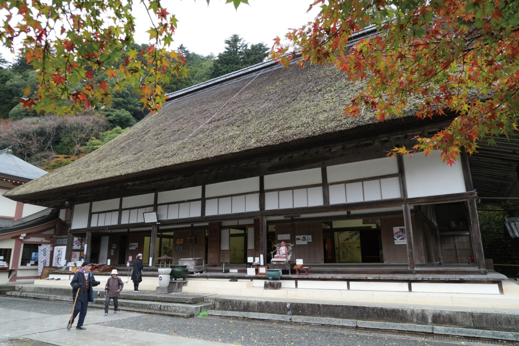 本堂は鎌倉時代の代表的な和様建造物として国宝に指定。例年11月頃には境内が鮮やかな紅葉に彩られ、とくに本堂周囲と庭園内の紅葉は「血染めのもみじ」と称されるほど深紅に染まる。