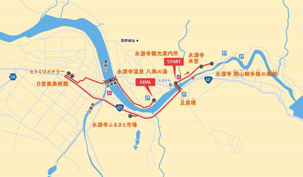 永源寺観光案内所をスタートし、120段あまりの石段がある羅漢坂をのぼって永源寺へ。深い自然に包まれた永源寺では、野鳥のさえずりや葉擦れ、愛知川の渓声に耳を傾けるのも心地よい。境内全体を覆う紅葉はもちろん、ひときわ美しいのが開山御手植の楓樹(かいさんおてうえのふうじゅ)。重く深みのある紅葉が訪れた人々を魅了する。