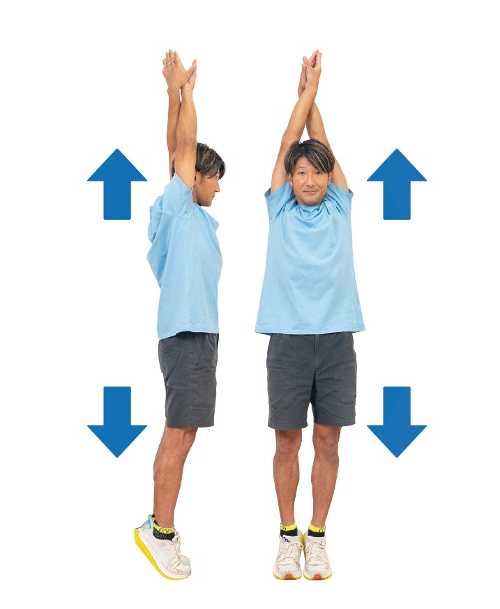 両足を閉じて、両手をクロスし、耳の横へバンザイする。