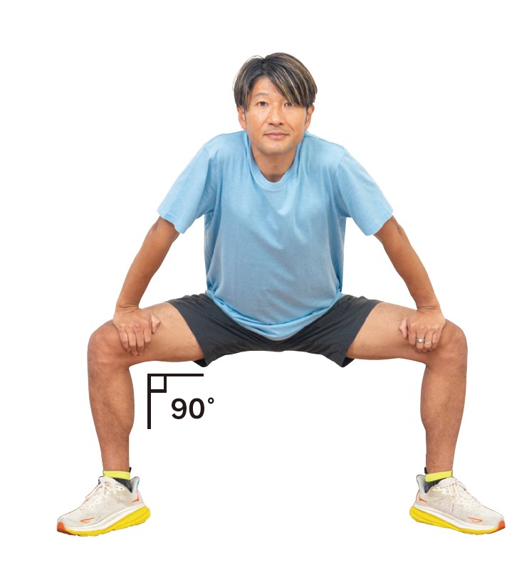 膝の内側に手を置き、膝の角度は90°をイメージしてお尻を落とす。