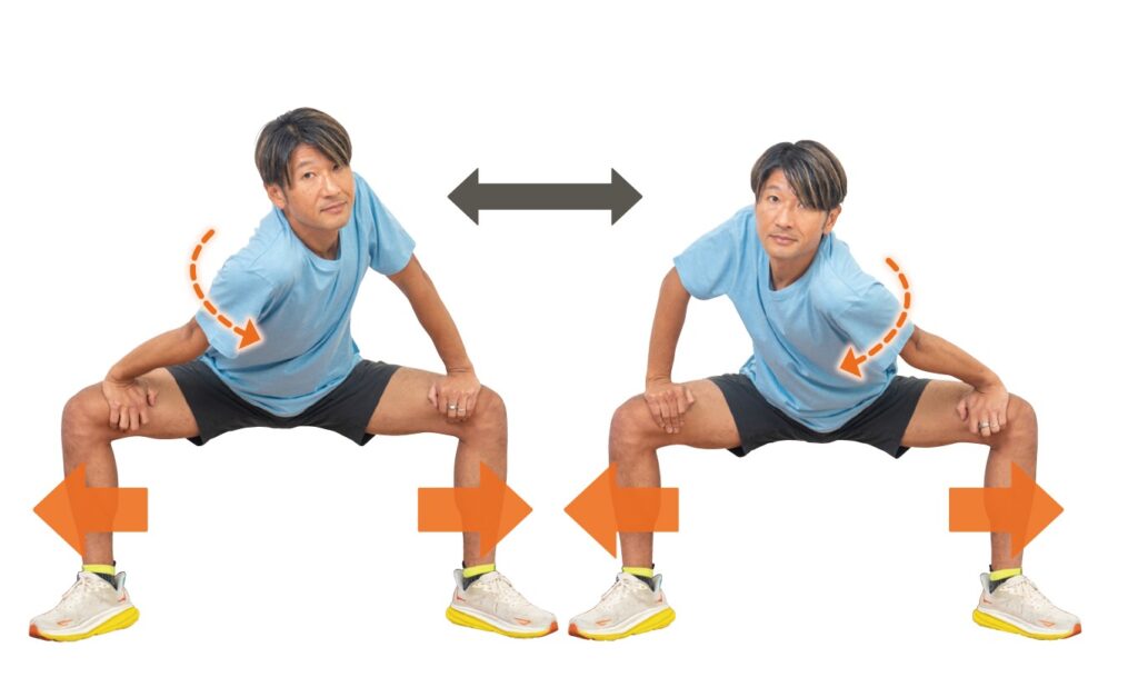 内ももと背中の伸びを意識しながら、左右5秒×5往復を行う