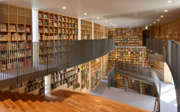 大阪出身の建築家・安藤忠雄が設計した絵本と図鑑がメインの図書施設。3階まで吹き抜けの壁一面が本棚で、12のテーマ別に並んでいる。中之島公園内に限り、持ち出し可能。