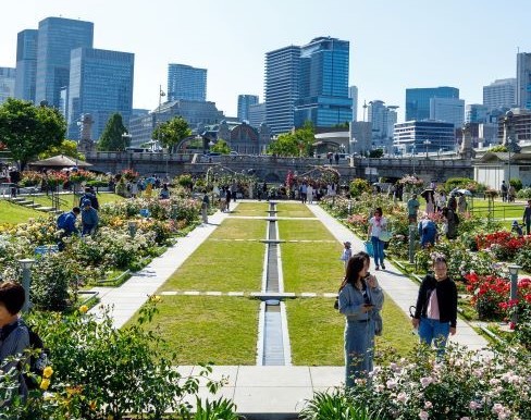 大阪市で初めて誕生した公園。堂島川と土佐堀川に挟まれた中洲にあり、5月と10月はバラ園が見頃を迎え、11~12月には「大阪・光の饗宴」メイン会場として賑わう。