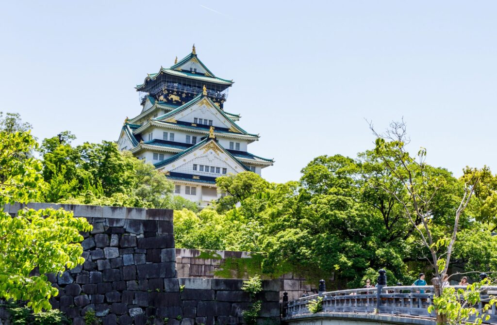 大 阪城公園駅を出て、大阪城ホールに向かって歩こう。ホール手前の噴水広場を左折して進んでいくと、堀と石垣、樹々の緑に囲まれて大阪城天守閣が姿を現す。