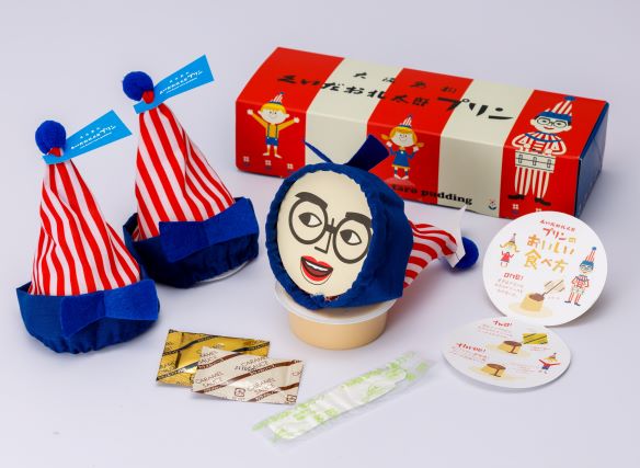 大阪名物 くいだおれ太郎の三角帽子をかぶったユニークなプリン。ほろ苦いカラメルソースとクラッシュシュガーのWソースは絶品!