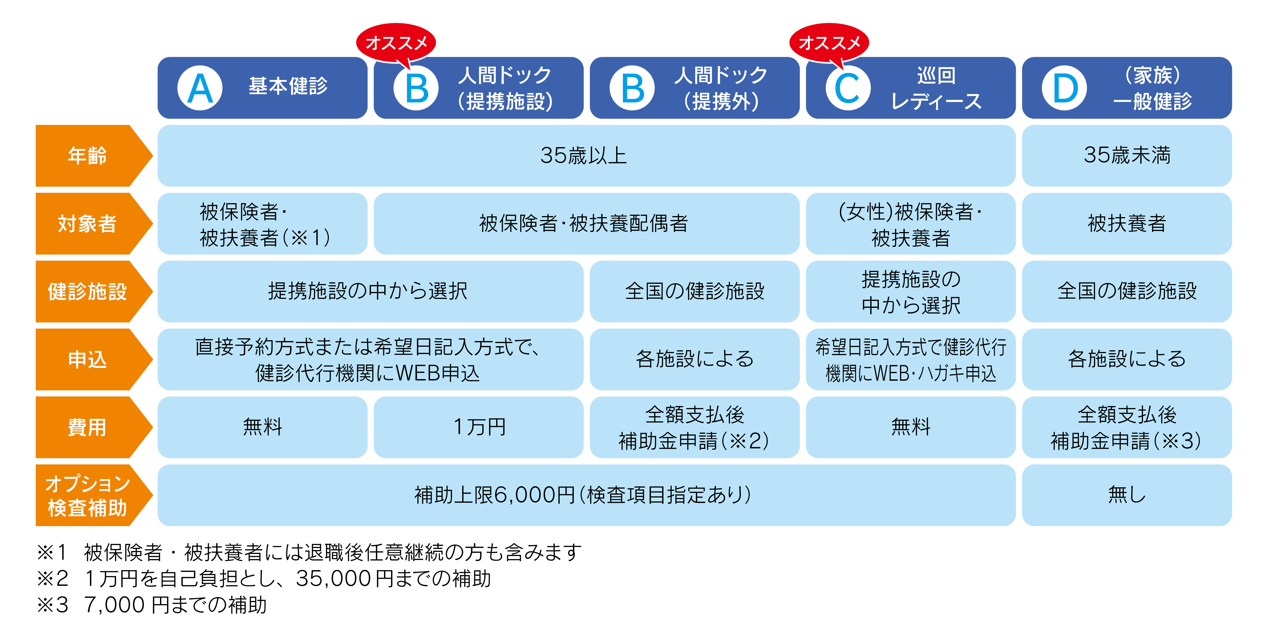 健診代行機関(ウィーメックス株式会社 旧:株式会社LSIメディエンス)が提携する施設で、指定の人間ドックコースであれば、自己負担1万円のみで受診できます。オプション検査も6,000円まで補助します(検査項目指定あり)が、超過する部分については、自己負担金1万円と併せて、健診当日窓口でお支払いください。