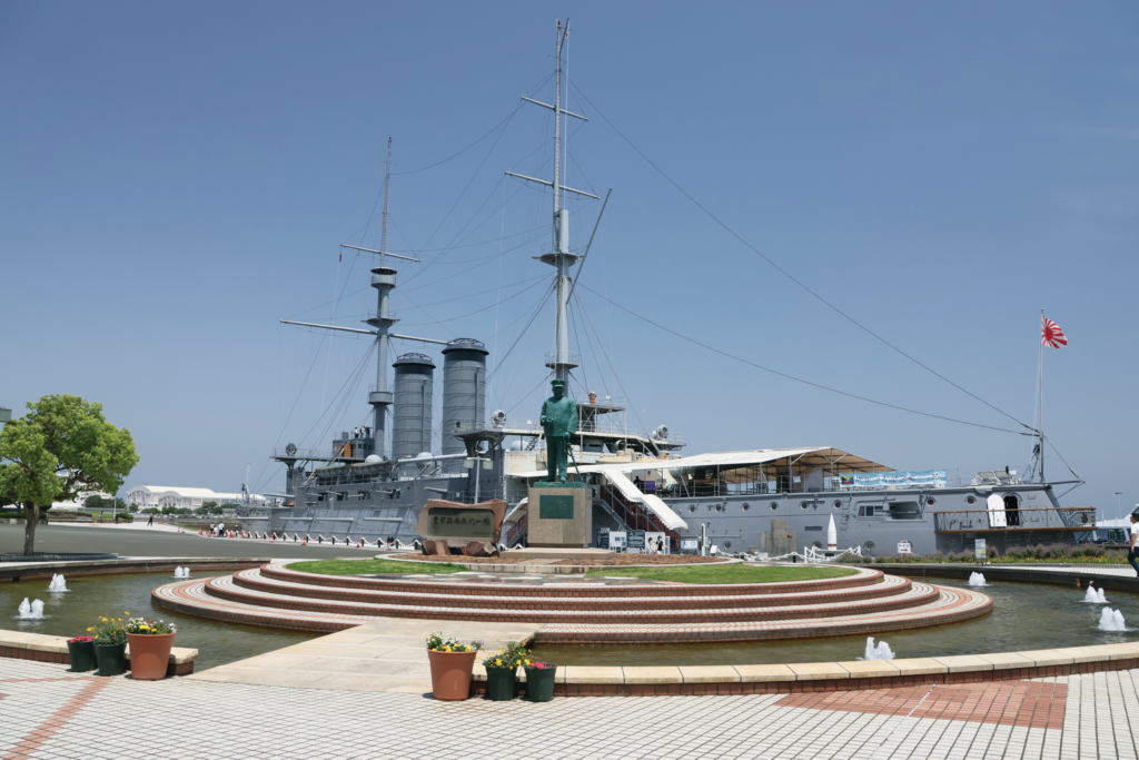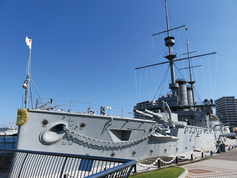 日露戦争の勝利に貢献した戦艦「三笠」。戦後、復元工事が実施され、1961年に往時の姿を取り戻した。